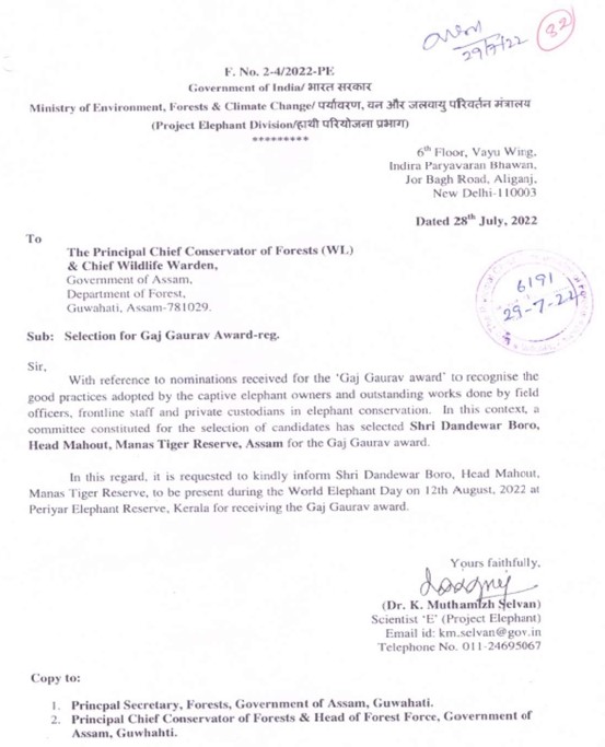 SHRI DANDESWAR BORO, HEAD MAHOUT RECIEVES GAJ GAURAV AWARD FROM THE GOVERNMENT OF INDIA FOR HIS OUTSTANDING CONTRIBUTION AND SELFLESS SERVICE FOR ELEPHANTS